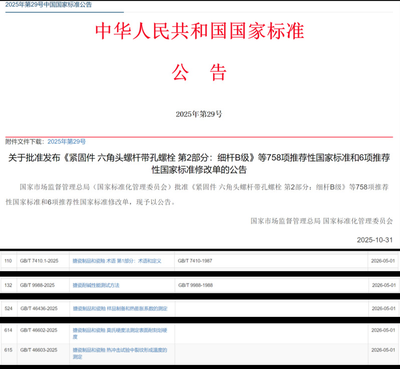 该5项推荐性国家标准由全国金属与非金属覆盖层标准化技术委员会搪瓷分技术委员会(SAC/TC57/SC3)执行,主管部门为中国机械工业联合会,将于2026年5月1日起实施。
