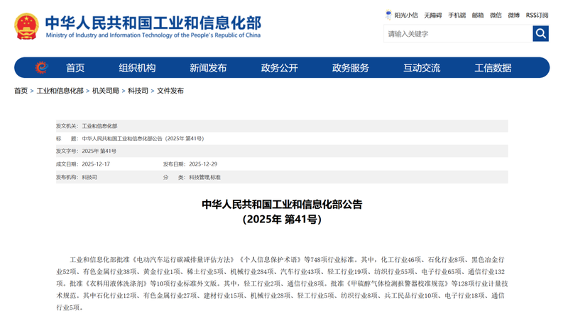 2025年12月17日,工业和信息化部发布2025年第41号中华人民共和国工业和信息化部公告,批准发布《电动汽车运行碳减排量评估方法》、《个人信息保护术语》等748项行业标准,其中包括: