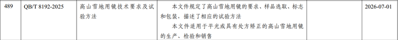 QB/T 8192—2025《高山雪地用镜技术要求及试验方法》是新制定的行业标准,该标准针对高山雪地环境强光反射、强风、高速冲击等特点,明确镜片光学性能、抗冲击性、防雾性等关键指标,能有效防护雪盲症等眼部伤害,对保障滑雪者安全、提升产品质量具有重要意义。